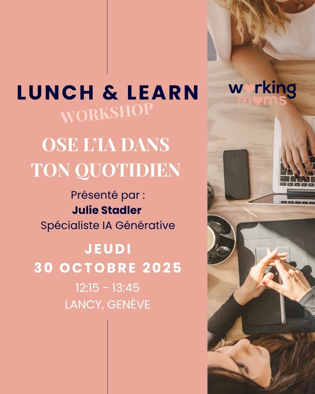 Rejoins-nous, en notant les prochaines dates dans ton agenda, pour venir explorer des sujets intéressants lors de ta pause de midi (12h15-14h00), en plus petit comité, avec d'autres Working Moms.
